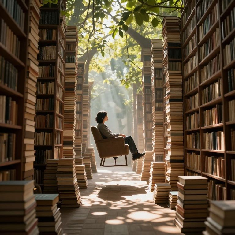 A solitary figure sits serenely on a levitating armchair amidst a labyrinthine path of towering book stacks, where sunlight filters through a canopy of leaves, casting an ethereal glow over this surreal library of dreams.