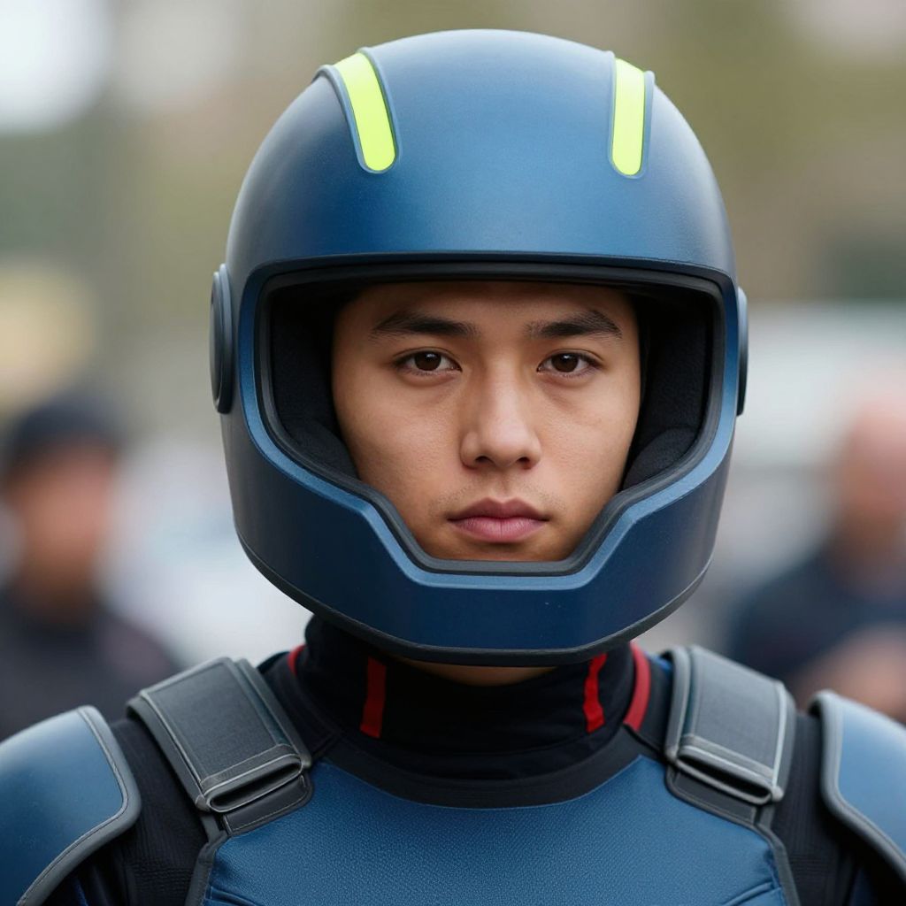 Photograph of a young Asian male wearing a blue, futuristic helmet with yellow stripes on top, and a black, armored vest with red accents. His expression is neutral, with slightly parted lips and dark eyes focused forward. The background is blurred, featuring indistinct shapes and colors, suggesting an outdoor setting with other people. The helmet's visor is clear, revealing his face. The image has a sharp, realistic style, emphasizing the sleek, modern design of the helmet and armor.