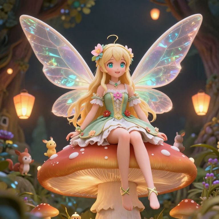 Fairy anime girl perched on a giant mushroom, her shimmering wings spreading wide, dressed in a whimsical outfit with floral accents, bright expressive eyes, surrounded by floating lanterns and tiny woodland creatures, fantasy art style.