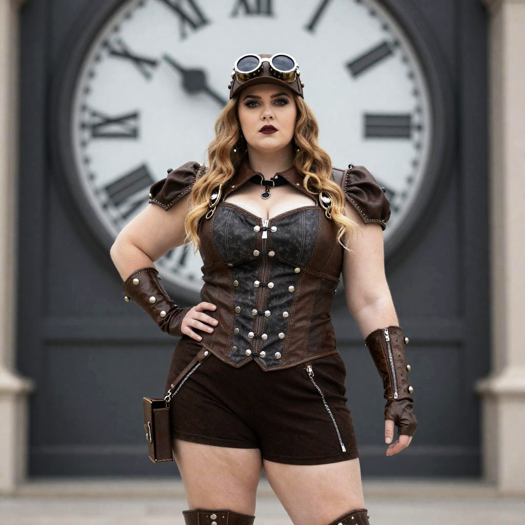 Plus Size Steampunk Costume Female, woman in steampunk outfit posing in front of a clock