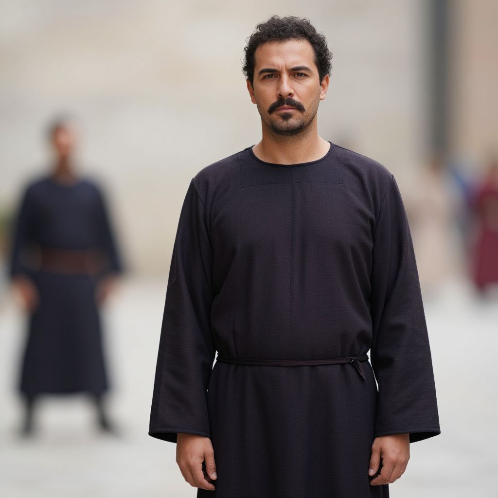 Iconic costume man, 1boy, male focus, solo, facial hair, robe, blurry background, blurry, mustache, outdoors, standing, long sleeves
