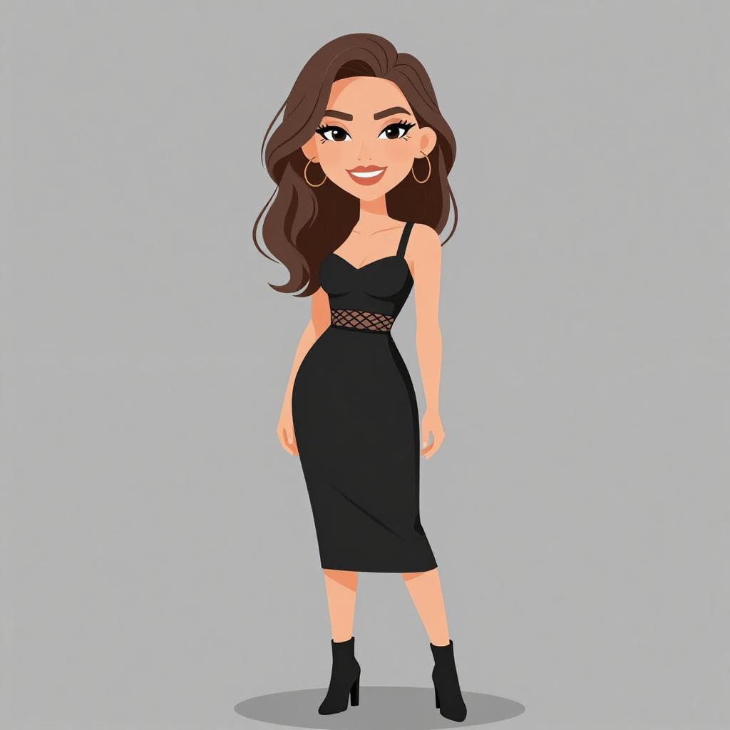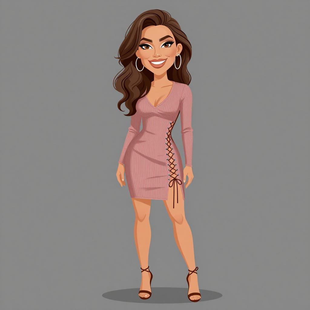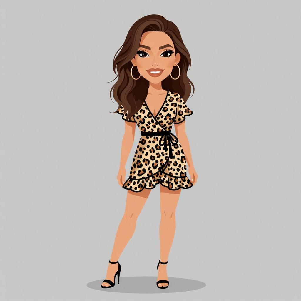 Woman with pretty face and pretty hair. smiling Woman, playful and trendy, leopard print wrap dress with a V-neckline, short flounce sleeves, tie waist, ruffled hem, mini length, paired with simple black strappy heels, studio background. --sref 1467
