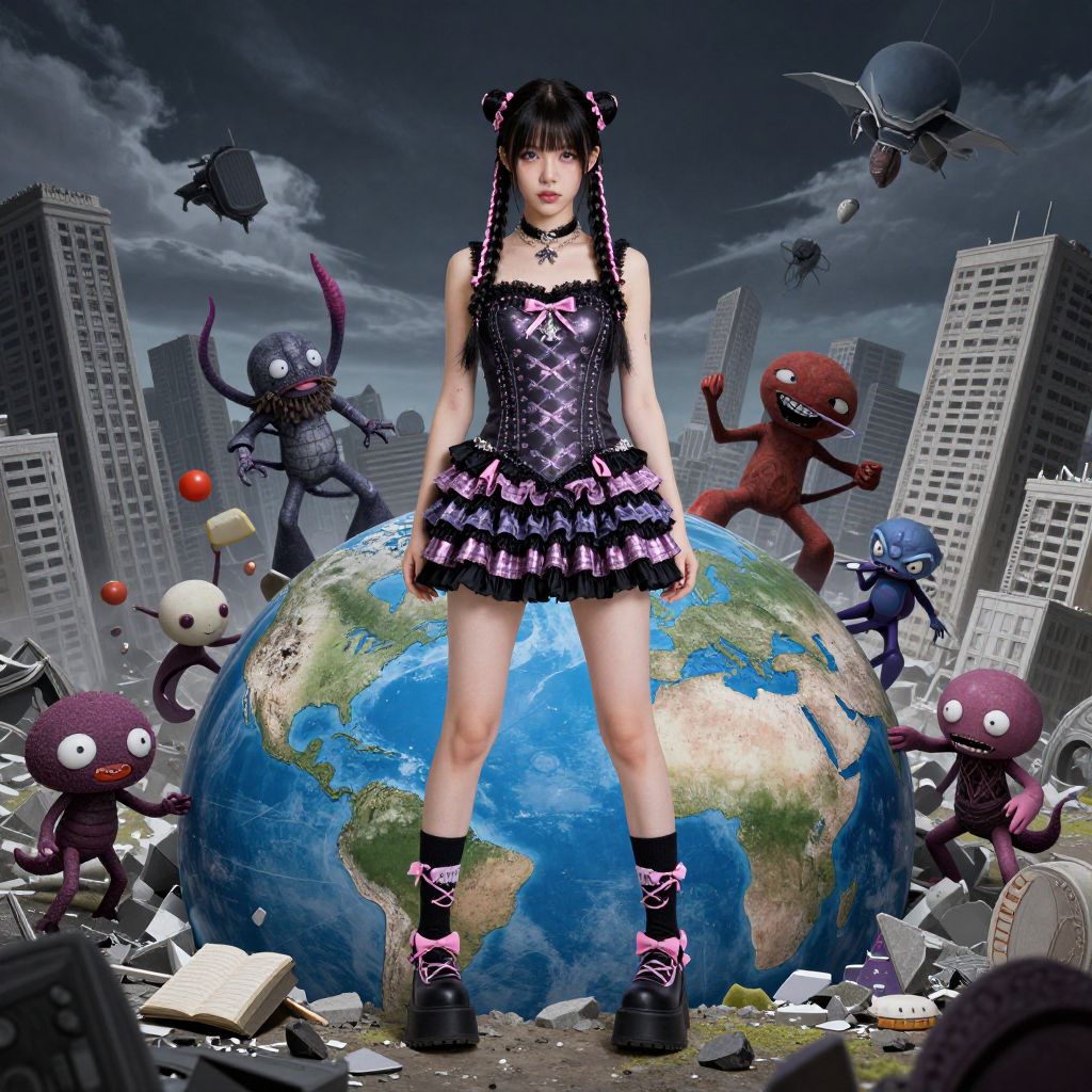 Photograph-style CGI image of a young Asian woman with pale skin and black hair in twin buns, wearing a black corset with pink bows, a short black and pink plaid skirt, and black platform shoes with pink accents. She stands confidently in front of a large, partially destroyed Earth, surrounded by a chaotic urban skyline with tall buildings. Numerous purple and red, alien-like creatures with large eyes and mischievous expressions leap around her, adding to the surreal and dystopian atmosphere. The sky is dark and cloudy, enhancing the ominous mood. Debris and books are scattered at her feet.