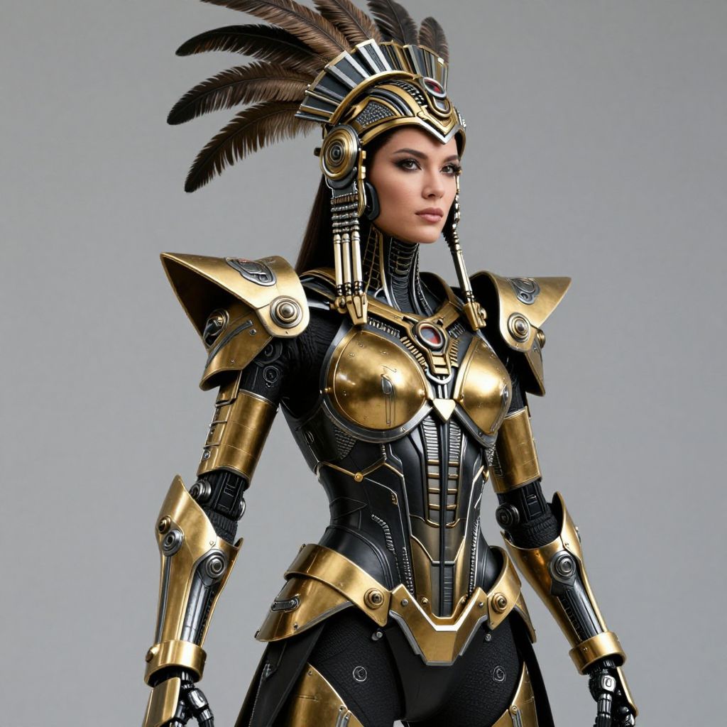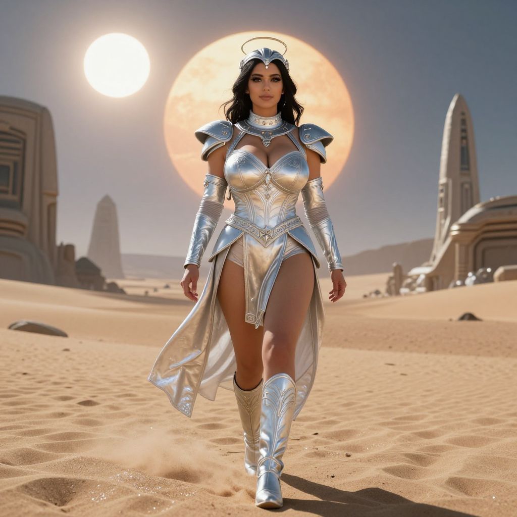 Photorealistic CGI image of a woman with long black hair, wearing a silver, intricately designed, armored outfit with shoulder pauldrons and high boots, and a revealing, high-slit, silver dress. She has a halo above her head and stands confidently in a desert landscape with a large, glowing sun behind her. The background features ancient, stone-like structures and distant, rocky terrain. The sunlight casts strong shadows, emphasizing the desert's sandy texture. Her expression is stern, and she exudes a sense of power and presence.