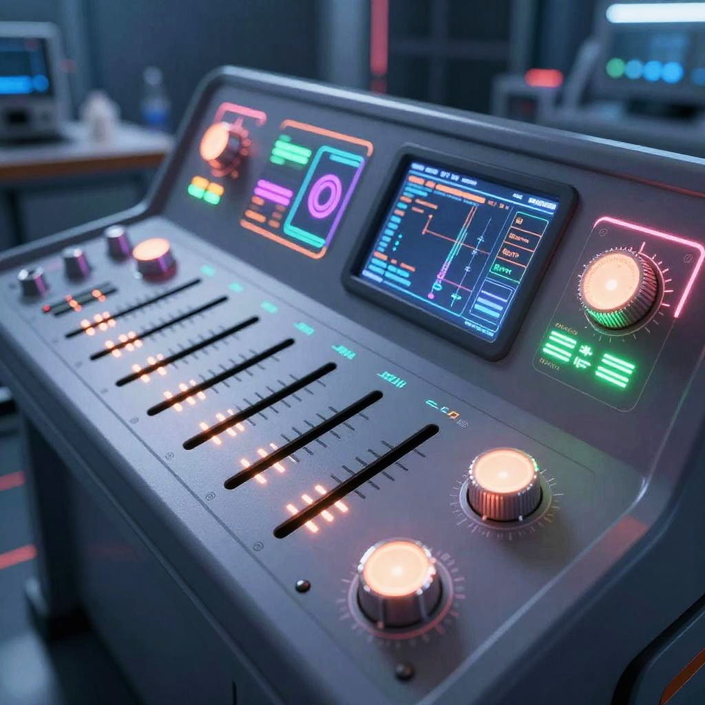Stable diffusion settings visualized as a sleek futuristic control panel with glowing sliders and dials, vibrant neon colors, intricate digital interface elements, cyberpunk style, high-tech laboratory background, ultra-detailed and dynamic composition.