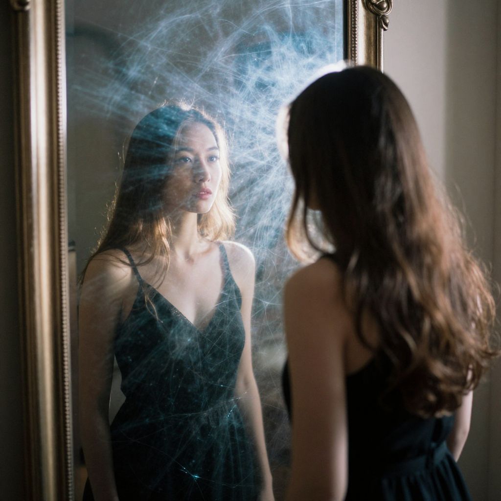 A woman stands before a grand mirror, her reflection shimmering with an ethereal glow, as if the glass distorts reality to reveal a vision of herself bathed in impossible light, defying the boundaries of time and truth.