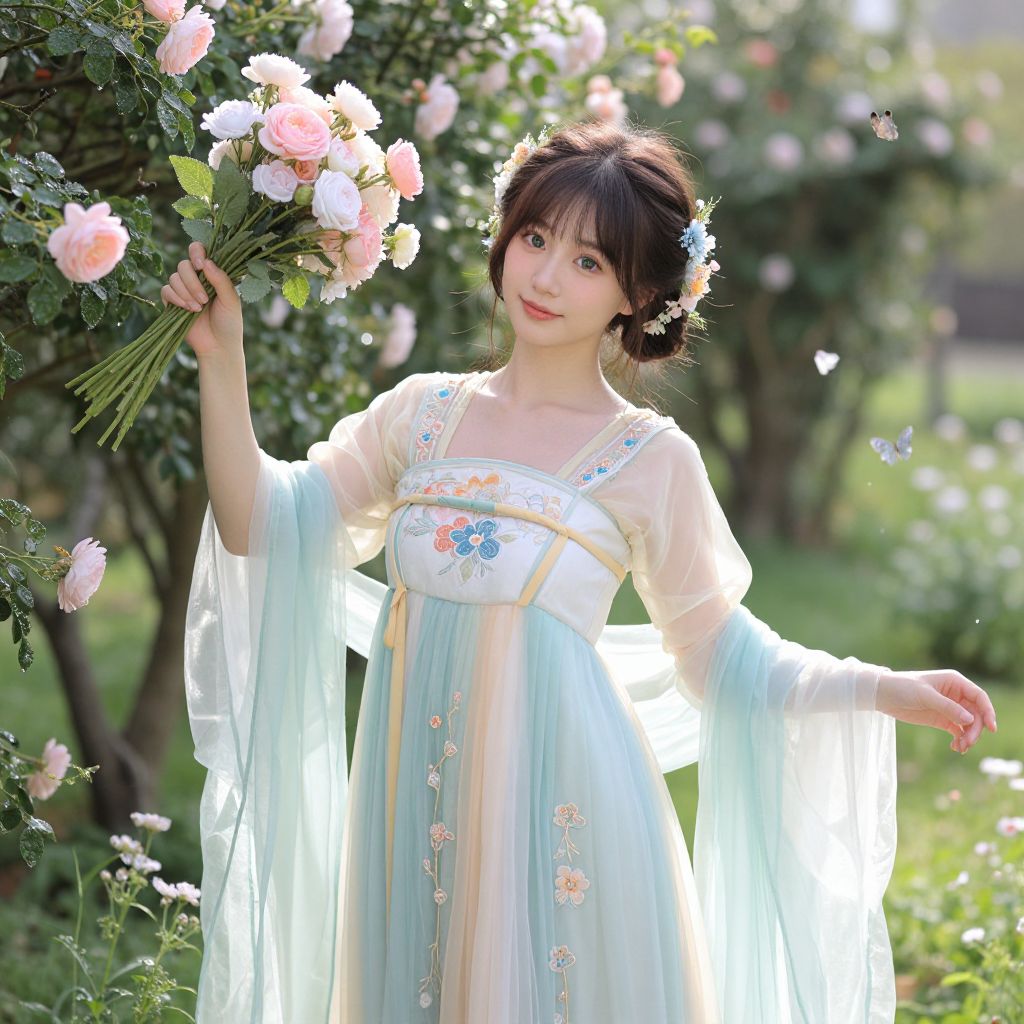 A young woman with fair skin, green eyes, and a soft smile dressed as a Spring nymph in a pastel-colored flowy gown with intricate embroidered flowers, standing by a blooming rose garden in springtime, sunlight reflecting off dewy petals, her arms slightly raised as if offering a bouquet of fresh pastel flowers, natural background with grass, wildflowers, and scattered butterflies. The woman has big tits and cute face