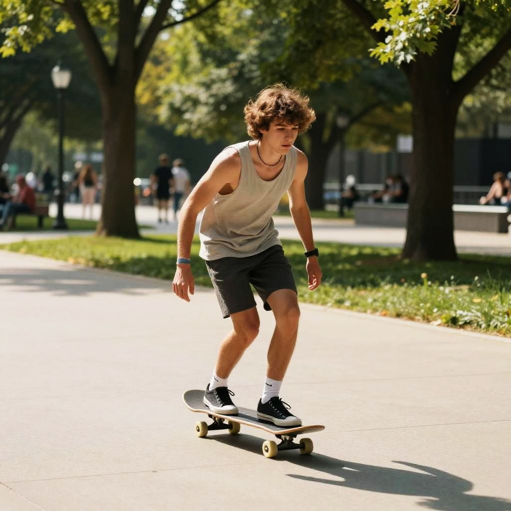 A young man enjoys a midday skateboarding session, dressed casually in a tank top and shorts, gliding along the smooth pavement surrounded by the verdant trees of a sunny park.