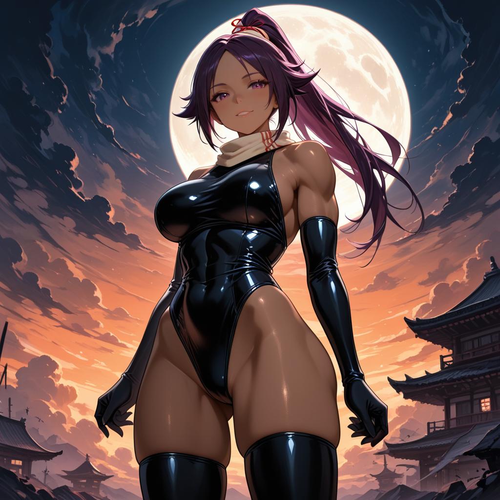 Masterpiece, best quality, absurdres, perfect antomy, cowboy shot, standing, outdoors, 1girl, solo, Shihouin Yoruichi, purple hair, looking at viewer, smile, black leotard, elbow gloves, muscular female, thighhighs, cloud, cloudy sky, orange sky, night, full moon