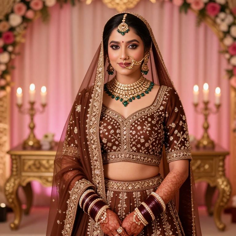 A stunning Indian bride wearing a beautifully crafted brown lehenga bridal outfit, complete with intricate zari work and delicate gold embroidery, standing in a traditional wedding setup with a pink and gold floral backdrop, soft candlelight, and a vintage wooden wedding altar in the background; her face is serene and glowing with joy, with warm brown eyes and fair skin, wearing traditional bridal jewelry including a gold nose ring and bangles