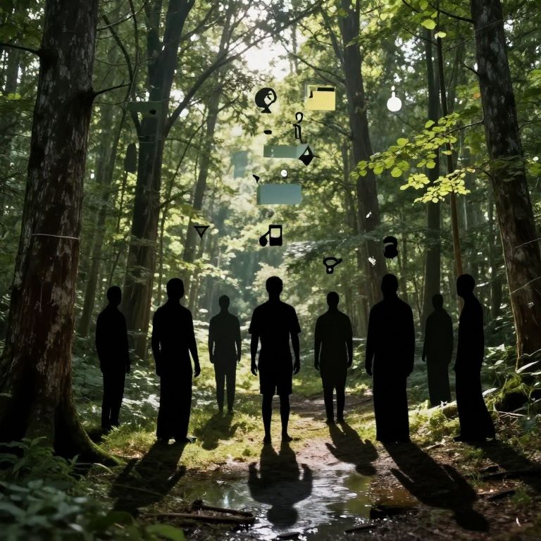 A forest where the trees whisper in pictographs shelters a tribe of shapeless silhouettes who communicate through shadows cast upon water.
