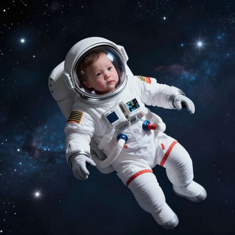A serene infant in a spacesuit floats effortlessly against a cosmic backdrop, suspended in zero gravity as if cradled by the universe itself.
