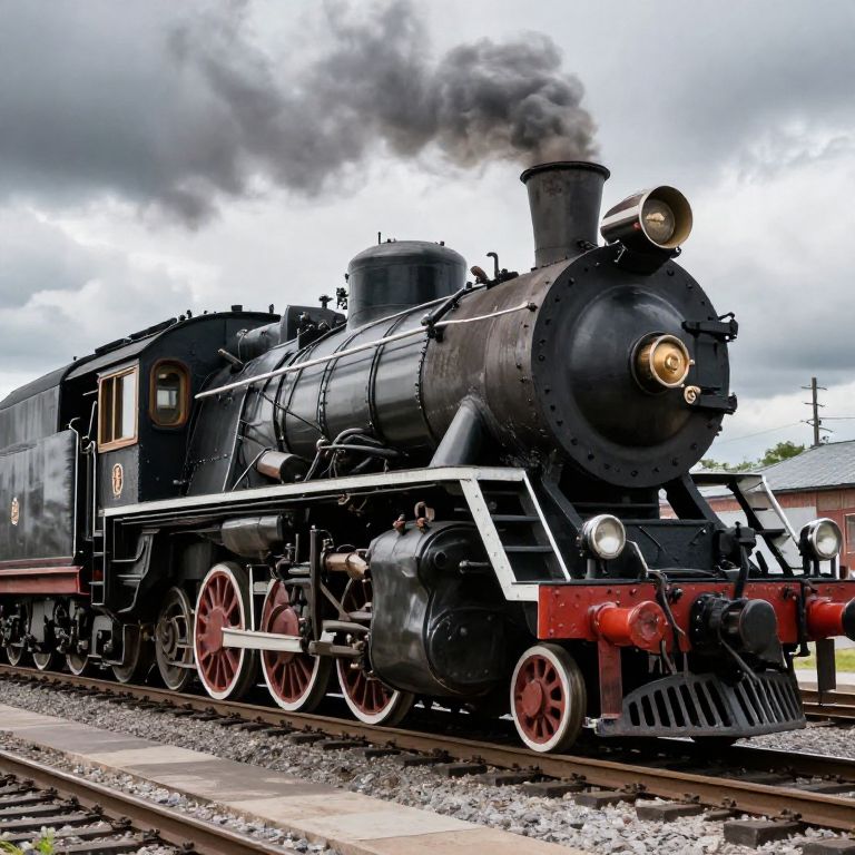 An enormous vintage steam locomotive engine weighing 50000 pounds, stationed on old railroad tracks, with intricate metalwork and steam pipes, under a moody sky with clouds, highly detailed and atmospheric