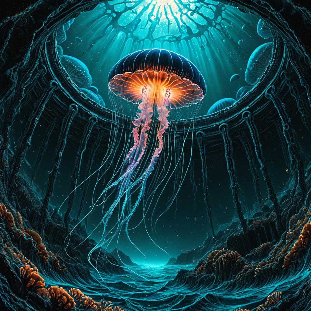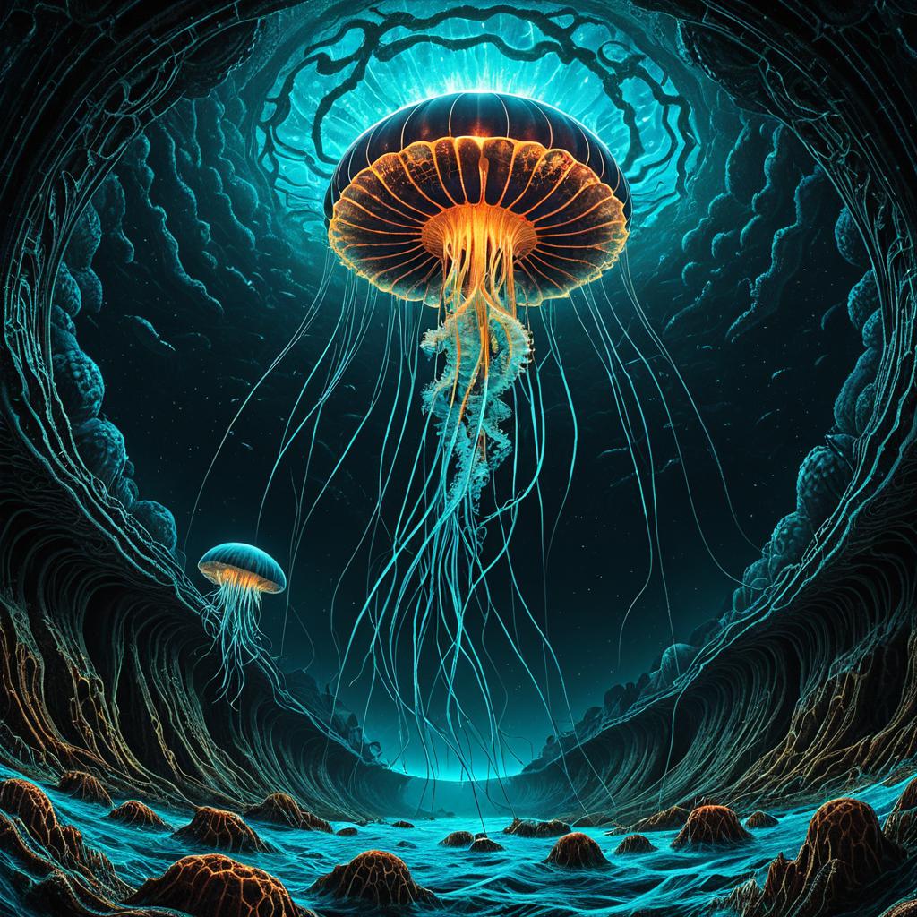 An neon jellyfish hovers above a deep ocean abyss with bioluminescent veins and fractal patterns, blending glitch textures and surreal distortions inspired by HR Giger, Zdzisław Beksiński, Roger Dean, exploring spiritual symbolism and hidden psychology, cinematic wide-angle perspective with volumetric lighting, hyper-detailed textures, ArtStation quality, 8K ultra-detailed render.