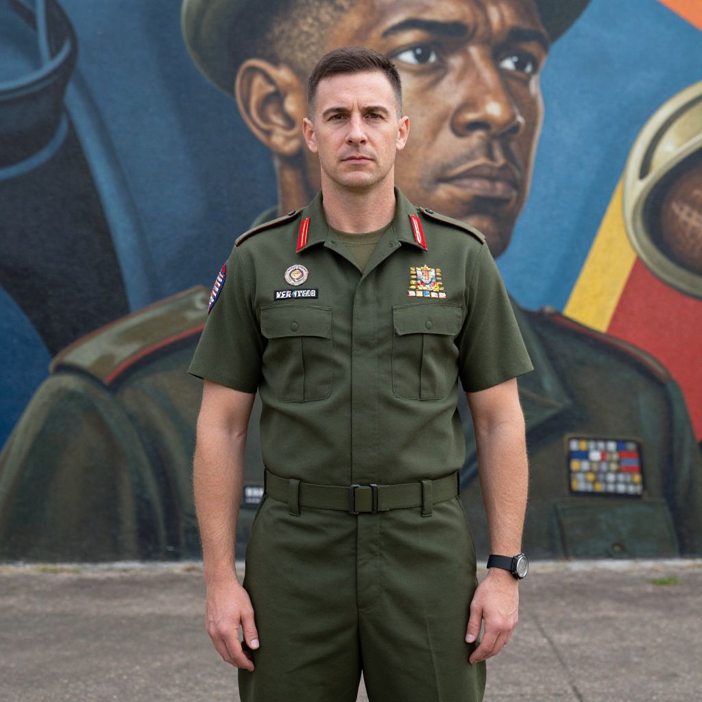 "Week Movie Character, a man in a military uniform standing in front of a mural"