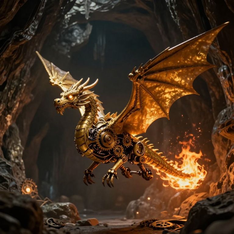 A clockwork dragon, half-gear and half-glowing starlight, coils lazily around a candle-lit chessboard etched into black ice.