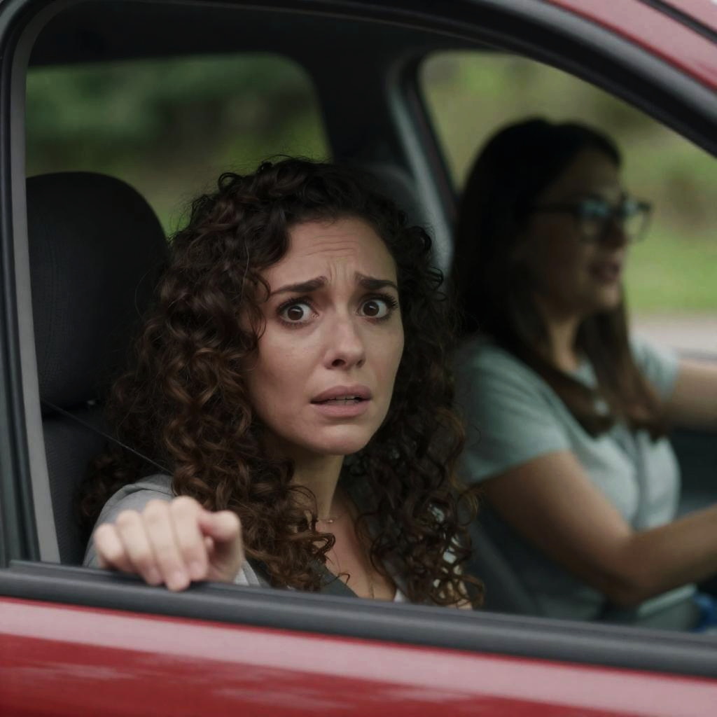 Photograph of two women in a dimly lit room. The woman on the left, with short curly hair, leans forward with a strained expression, hands on a green table. The woman on the right, with wavy brown hair, looks towards the first woman. A chandelier is in the background. A green tablecloth covers the table. The woman on the left wears a dark dress with white trim. The scene conveys tension and emotion.