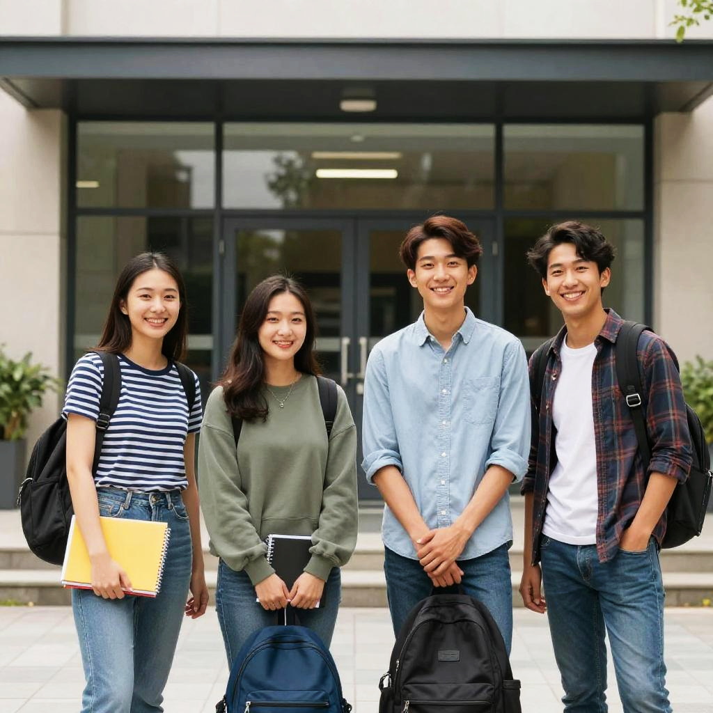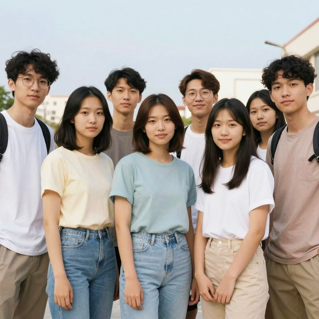 A group of young people sitting in a casual indoor meeting or discussion, one young man in a blue t-shirt smiling, soft warm lighting, informal modern setting with muted colors, bulletin board with paper notes in the background