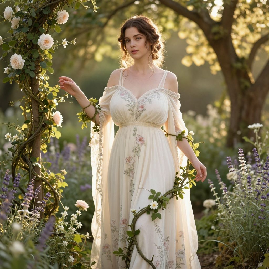 A beautiful woman in a flowing garden goddess costume stands in a lush, sun-drenched garden, her long ivory gown adorned with delicate floral embroidery that blends seamlessly with the blooming vines. Her face is soft and serene, with porcelain skin, high cheekbones, and gentle brown eyes, reflecting peace and harmony with nature. The vines wrap around her arms and legs, intertwining with wild roses, lavender, and jasmine, as golden sunlight filters through the trees, creating a dreamy, realistic photography scene.. The woman has big tits and cute face