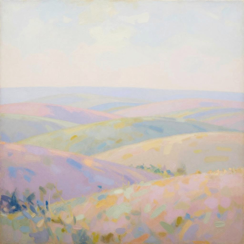 Impressionistic painting of a sunlit, pastel-colored landscape with gently rolling hills, soft pink, yellow, and blue brushstrokes, under