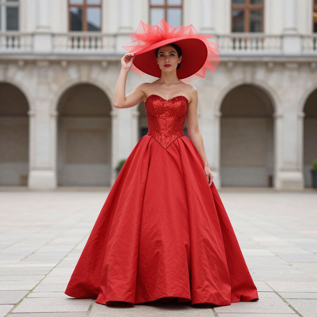 Elegantly poised woman dons a striking red couture ensemble featuring a voluminous skirt, sparkling bodice, and a wide-brimmed hat with flowing tulle, captured in a grand architectural setting reminiscent of a European square.