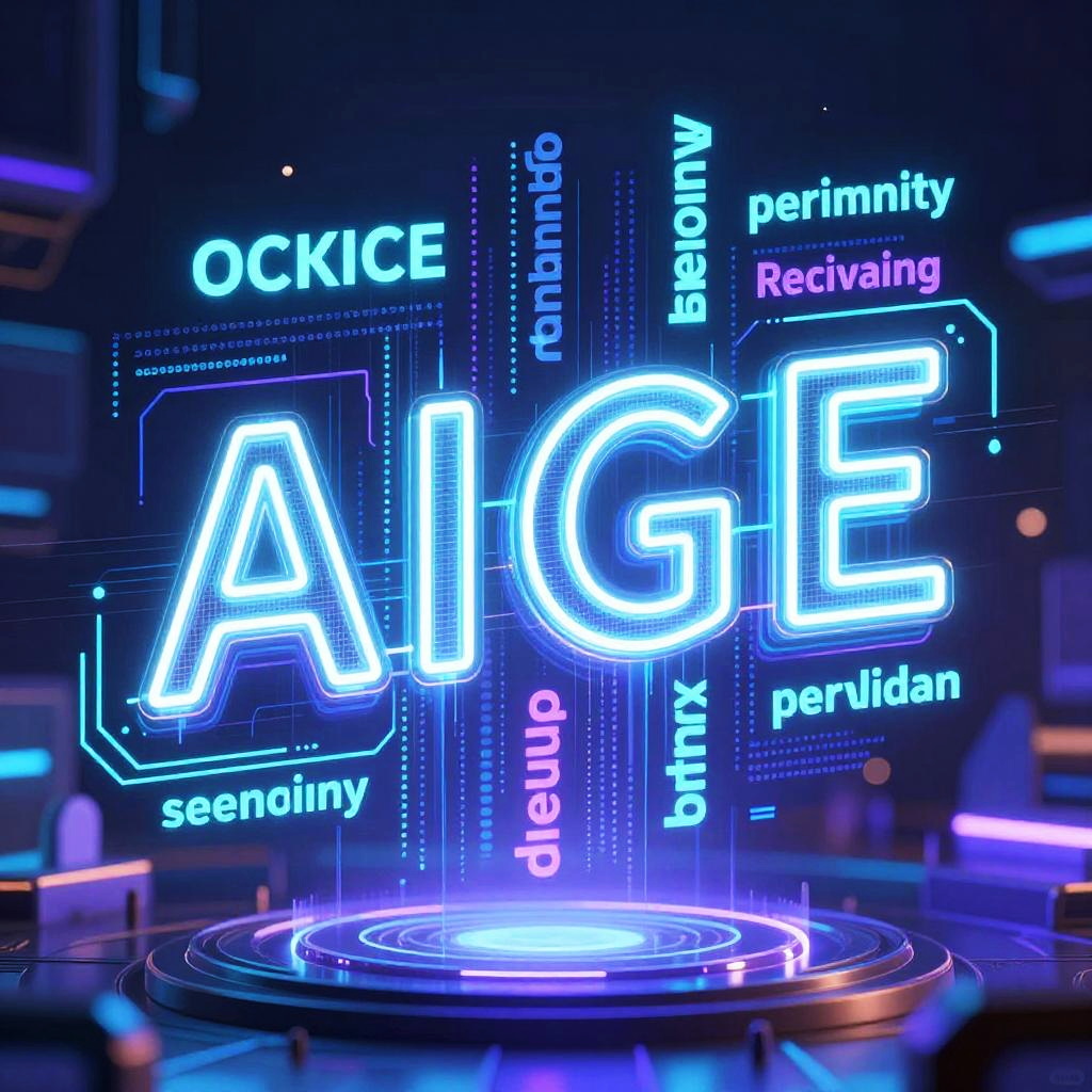 Neon-lit CGI image of the word "AIGE" in glowing blue letters, surrounded by technology-themed words in various neon colors, hovering