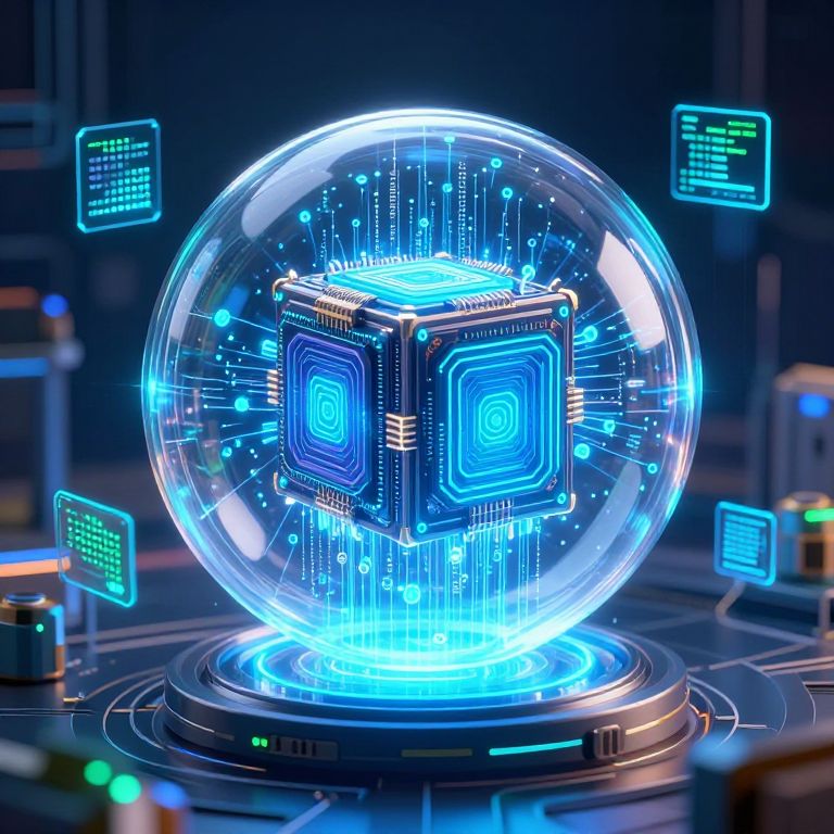Ai generator.com concept art showing a powerful AI core inside a transparent sphere, surrounded by data streams and floating algorithms, vibrant colors with electric blue and green accents, detailed sci-fi background with technological elements
