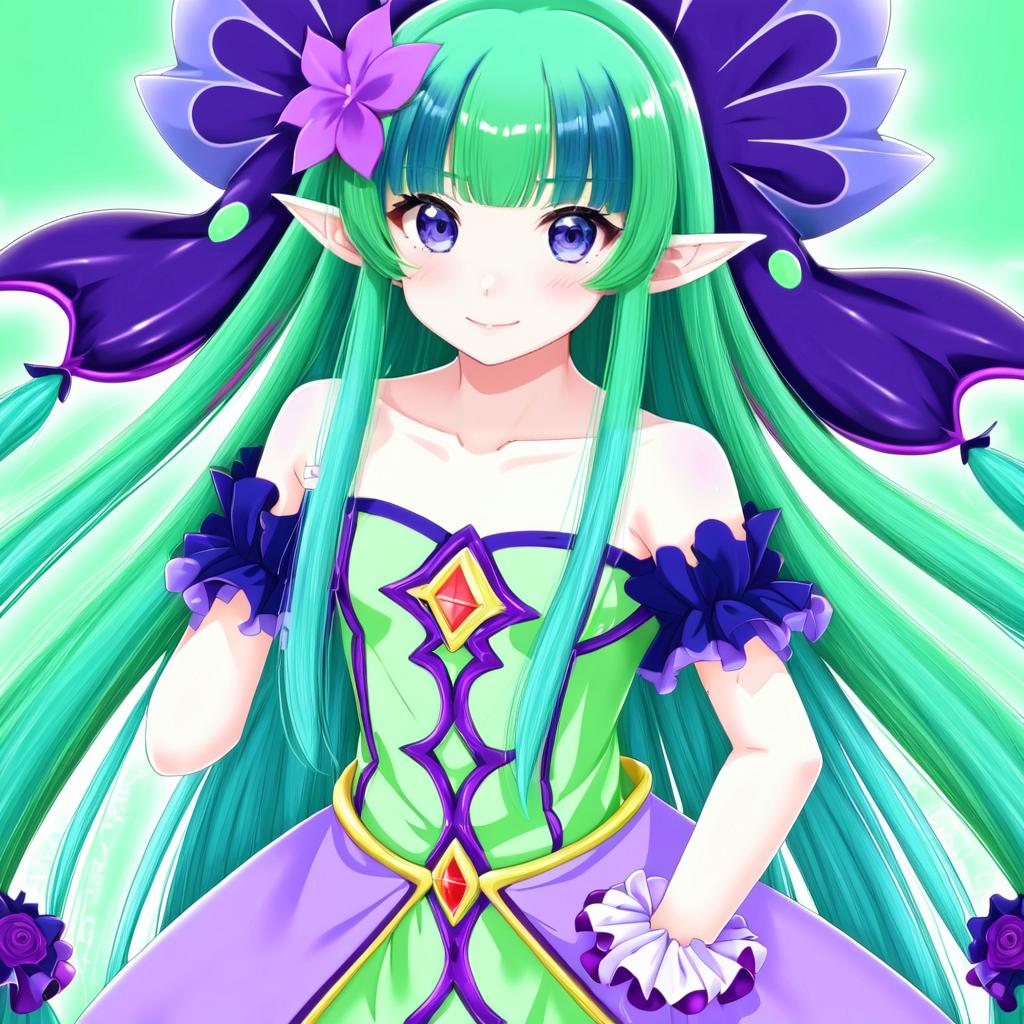Digital anime-style illustration of a female character with long two-tone green and blue hair, purple eyes, and pointed elf-like ears. She wears a detailed strapless dress in green and purple with ornate patterns and a flower hair accessory. The character has a confident expression, bare shoulders, and detailed shading typical of anime art.