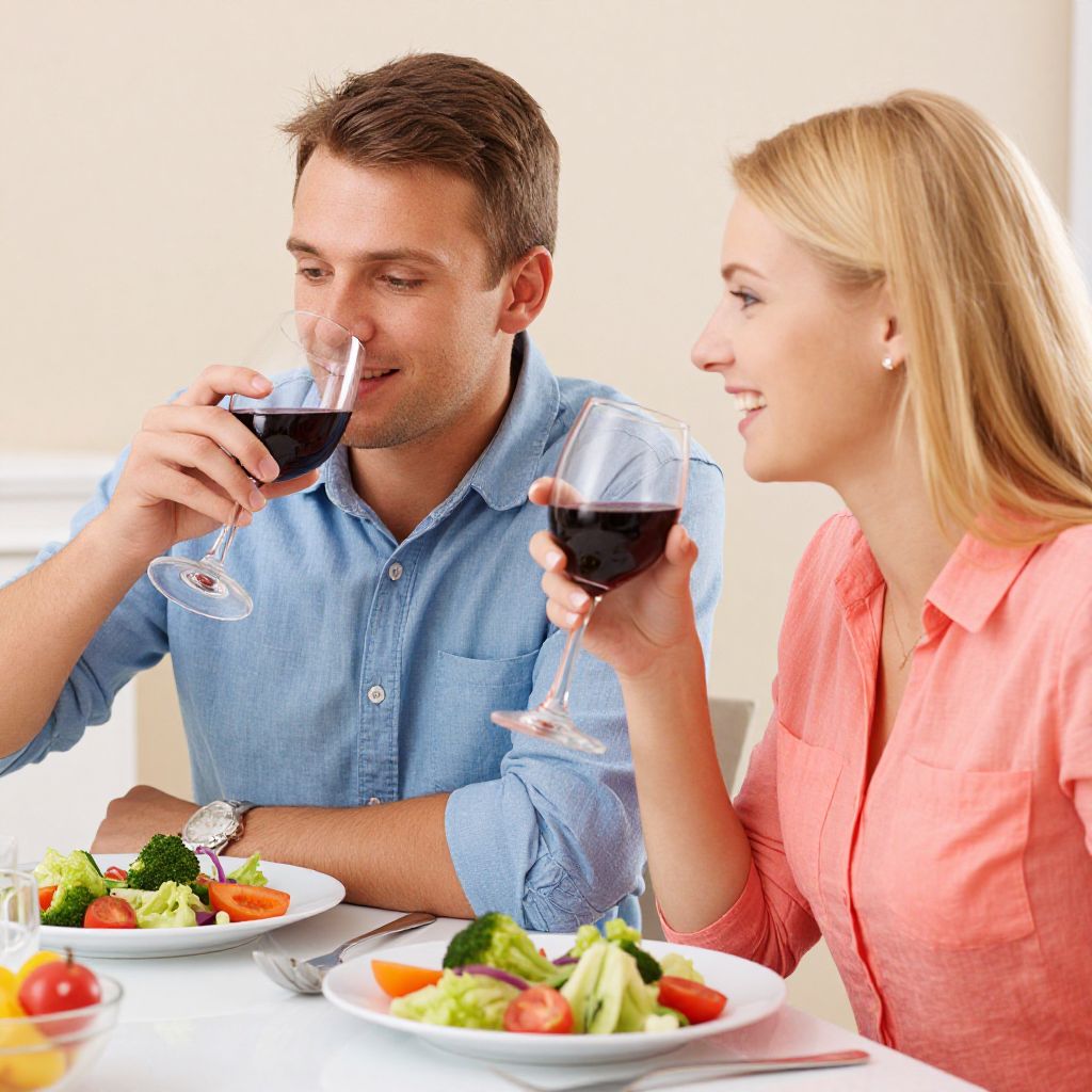 A bright, cheerful photo of a young couple dining together. The man, with short brown hair and a blue shirt, is smiling and sipping red wine. The blonde woman, in a pink shirt, laughs and holds her wine glass. They're seated at a white table with colorful salads in front of them. The background is a softly lit, beige wall, adding warmth to the scene.