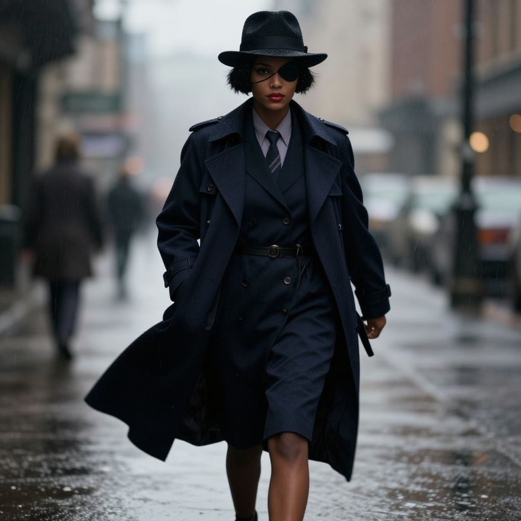 Hyperrealistic art Film Noir Elegance - A 1920s Private Eye on the Trail, In the city's underbelly, a 1920s private investigator prowls the rain-soaked streets, draped in a trench coat that billows with the rhythm of her purposeful steps. The coat's deep hue, reminiscent of the shadows she navigates, conceals her form as she delves into the enigmatic cases that define her career. With a fedora casting a veil over her eyes, she becomes an embodiment of film noir elegance, embodying the mystery and allure of a bygone era., (masterpiece:1.3), (extremely intricate), (photorealistic:1.4), (extremely delicate), (ultra realistic:1.3), CG unity, 8k wallpaper, HDR, RAW photo, dslr, front lighting, fantasy, elegant, lifelike, photorealistic, digital painting, (realistic skin texture, soft light, sharp:1.2), crisp image, sharp image, clear image, vivid image, noiseless image, (((clean skin, neat skin, perfect skin))), (Layered Depth, Parallax Effect, Soft focus foreground), vivid hues, fantasy setting, pronounced elaborated, imanating a soft, other worldly glow, (whimsical atmosphere:1.1), (powerful energy:1.1), (((full body view:0.86))), ((hands aside)), (very beautiful young female face:0.8), (high detailed skin texture, intricate face), (highly symmetric proportions:0.6), perfect teeth, (sharp_pointed_nose:0.6), high detailed eyes, intricate eyes, cute female face, (((with ((Kenyan :1.4)) roots and appearance, known supermodel with the full beauty ratio of this nations))) . Extremely high-resolution details, photographic, realism pushed to extreme, fine texture
