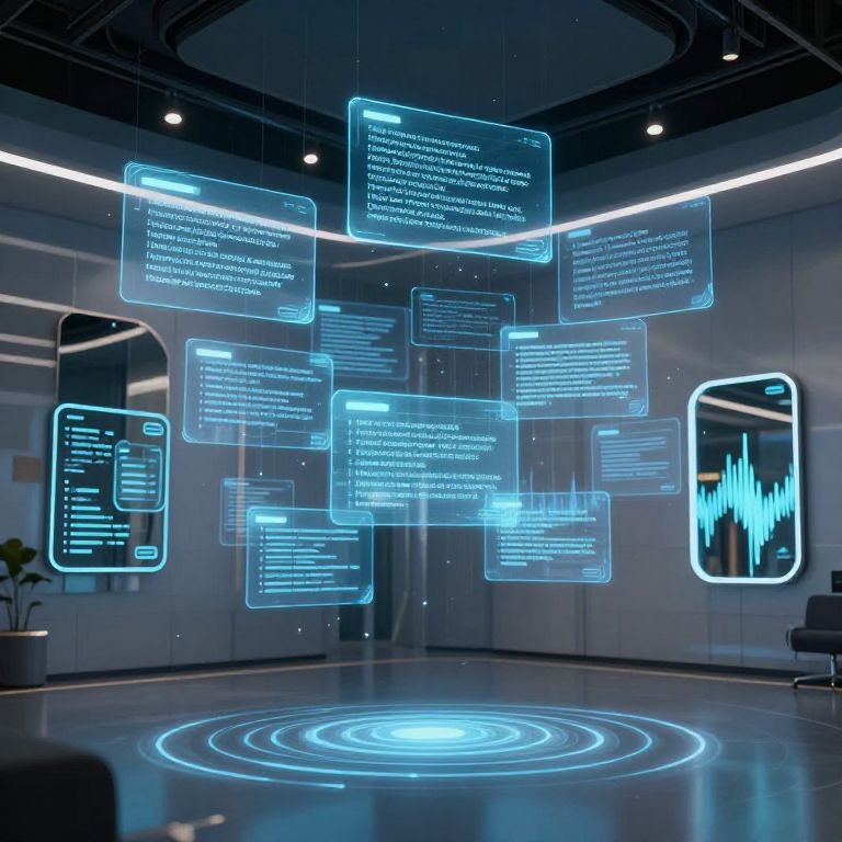 Prompts hot: A futuristic brainstorming room with floating holographic text prompts suspended mid-air, interacting with AI interface panels, smart mirrors, and ambient AI-generated sound waves. Futuristic, sleek, and immersive.