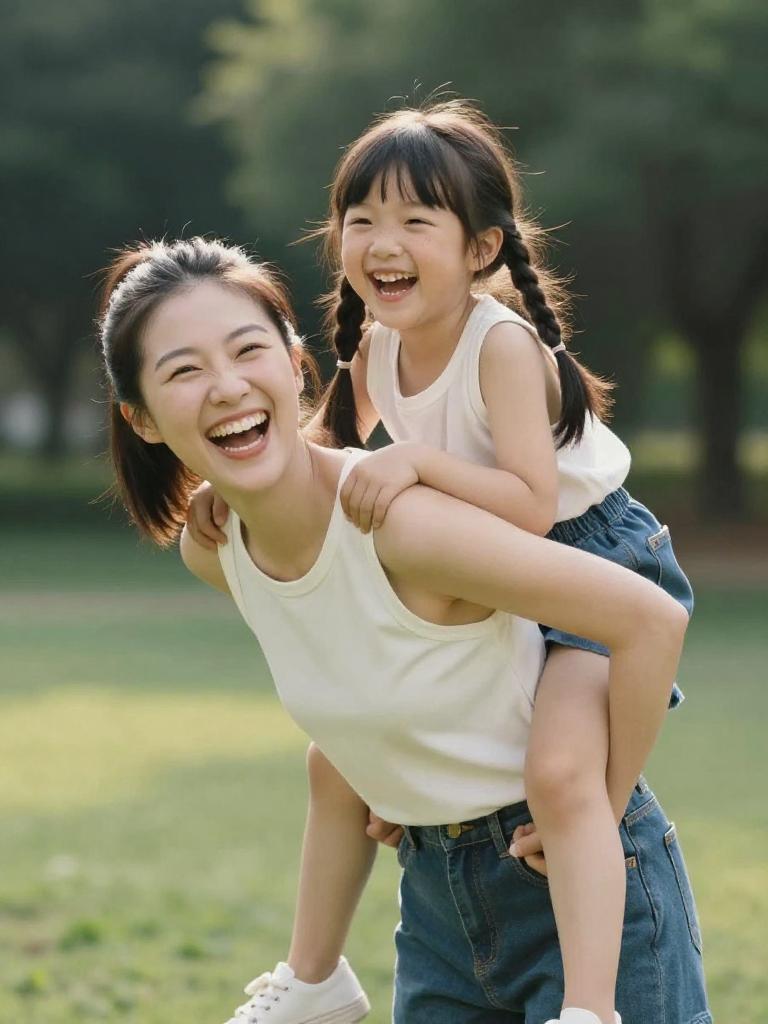Mother and daughter, joyful close-up of a mum carrying her daughter on her back, both laughing toward the camera, Asian mum with dark braid over one shoulder and girl with long wavy hair and laughing face, mum in sleeveless blouse and daughter in ruffled dress, golden-hour sunlight with warm lens flare, soft-focus trees and sky in the background, vibrant outdoor family lifestyle stock photo, high resolution, ultra-detailed