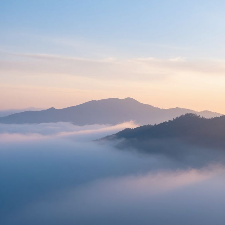 This photograph captures a serene, misty mountain landscape at dawn. The image features layered mountain ranges silhouetted against a gradient sky, transitioning from soft yellow near the horizon to a pale blue above. Thick, white mist blankets the lower mountain slopes, creating a dreamy, ethereal atmosphere. The mountains, dark and shadowy, provide contrast to the bright, pastel-colored sky. The overall composition is peaceful and calming, with soft textures from the mist and sharp lines from the mountains, evoking a sense of tranquility and natural beauty. The photograph emphasizes the delicate interplay between light and shadow.