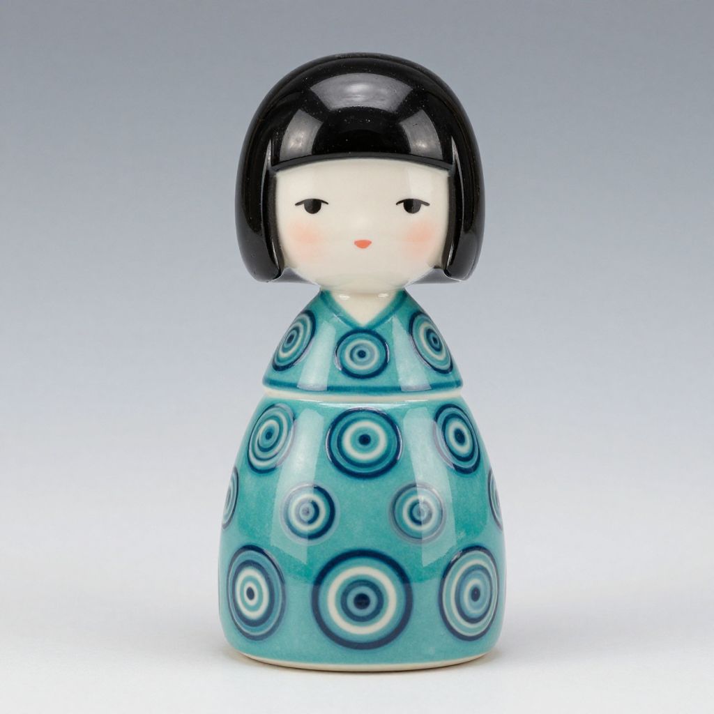 This photograph features a ceramic figurine of a Japanese-style woman with a pale, smooth face, black bob-cut hair, and minimalistic black eyes and pink lips. She wears a teal, cylindrical dress adorned with blue and white circular patterns. The background is a gradient from light gray to white, highlighting the figurine. The ceramic texture is glossy, and the design is modern with a whimsical, almost cartoonish aesthetic. The figurine stands centered, with a slight forward tilt, giving it a gentle, inviting presence.