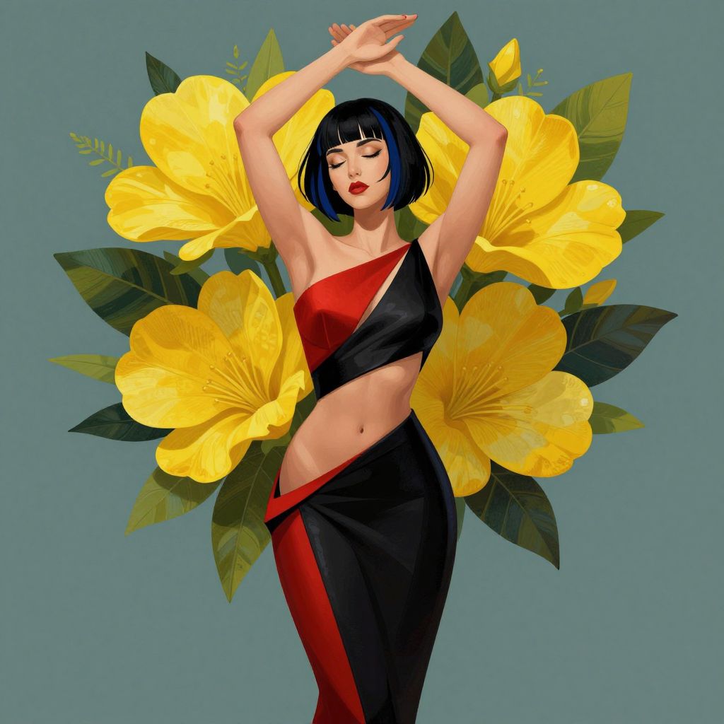 Digital illustration of a slender woman with fair skin and short, straight black hair with bangs. She stands with arms raised, eyes closed, and red lips slightly parted. She wears a strapless, form-fitting dress with black and red diagonal stripes, revealing her midriff. Behind her, large, vibrant yellow flowers with green leaves create a striking contrast against a teal background. The flowers have detailed petals and textures, adding depth to the image. The overall style is modern and vibrant, emphasizing bold colors and clean lines.