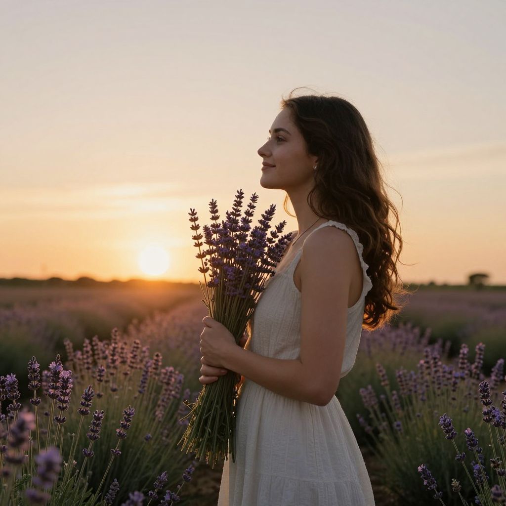 Embracing the ephemeral beauty of twilight, a young woman cradles a bouquet of lavender, her smile radiating serenity and hope as the sun's golden embrace bathes the field in a symphony of warmth and tranquility.