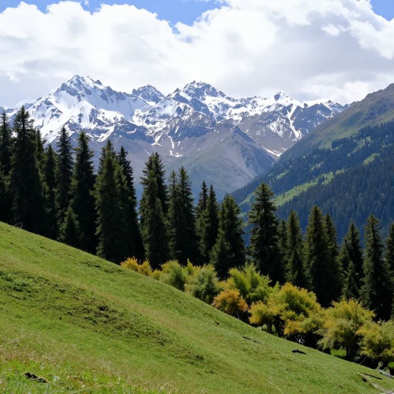 Photograph of a lush, green mountain landscape featuring a grassy hill in the foreground with scattered bushes and trees. Tall, dark evergreen trees line the midground, leading to a backdrop of majestic, snow-capped mountains under a bright blue sky with fluffy white clouds. The mountains have a mix of dark green forested areas and rocky peaks. The image captures the vivid contrast between the greenery and the white snow, highlighting the natural beauty and serene atmosphere of the mountainous region.