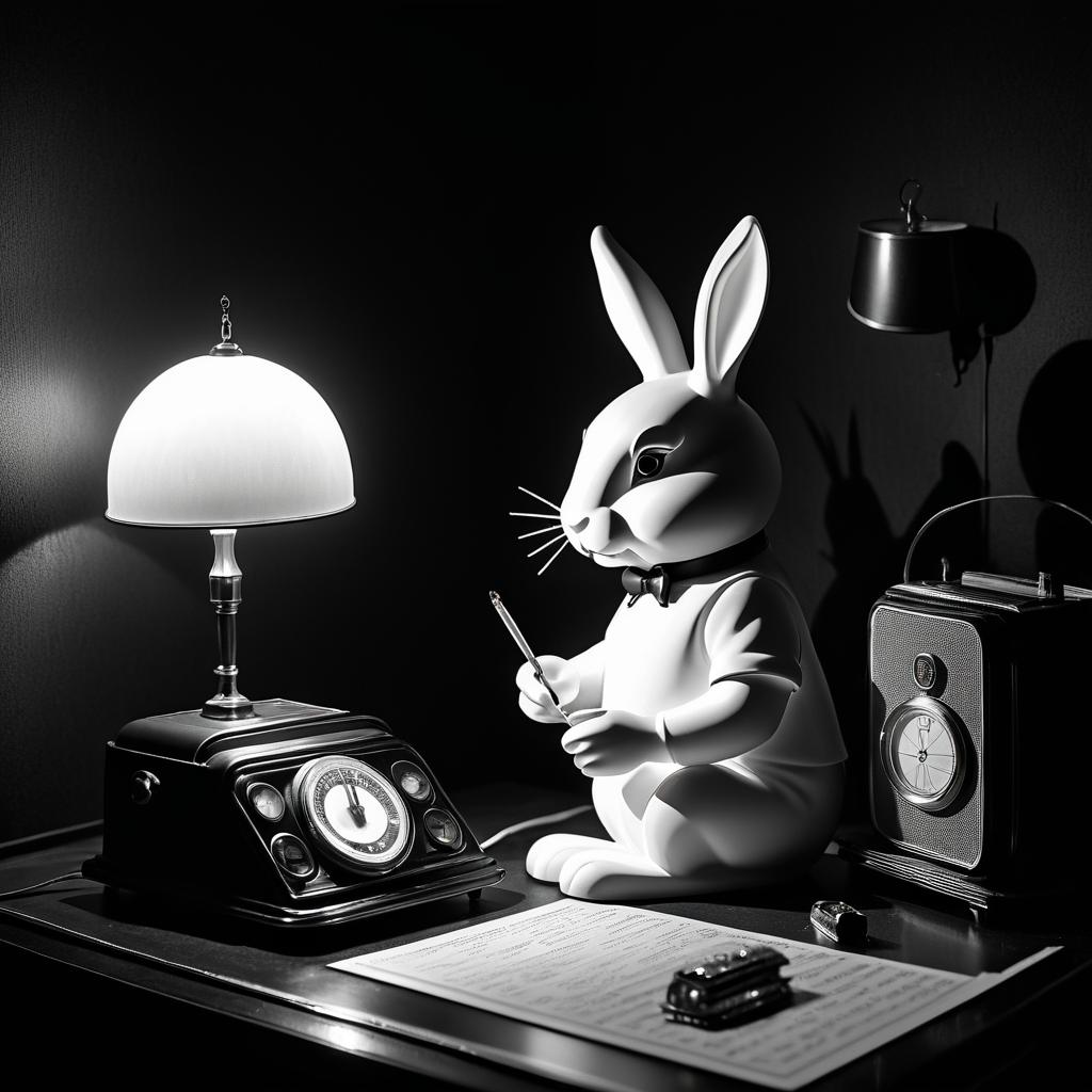 Black and white image of a stylized white rabbit figurine smoking and writing with a pen beside a retro radio and vintage lamp. The scene features 1920s noir aesthetic with strong contrasting shadows and soft lamp lighting on a dark room background. There is sheet music and a small toy vehicle on the desk, adding to the vintage atmosphere.