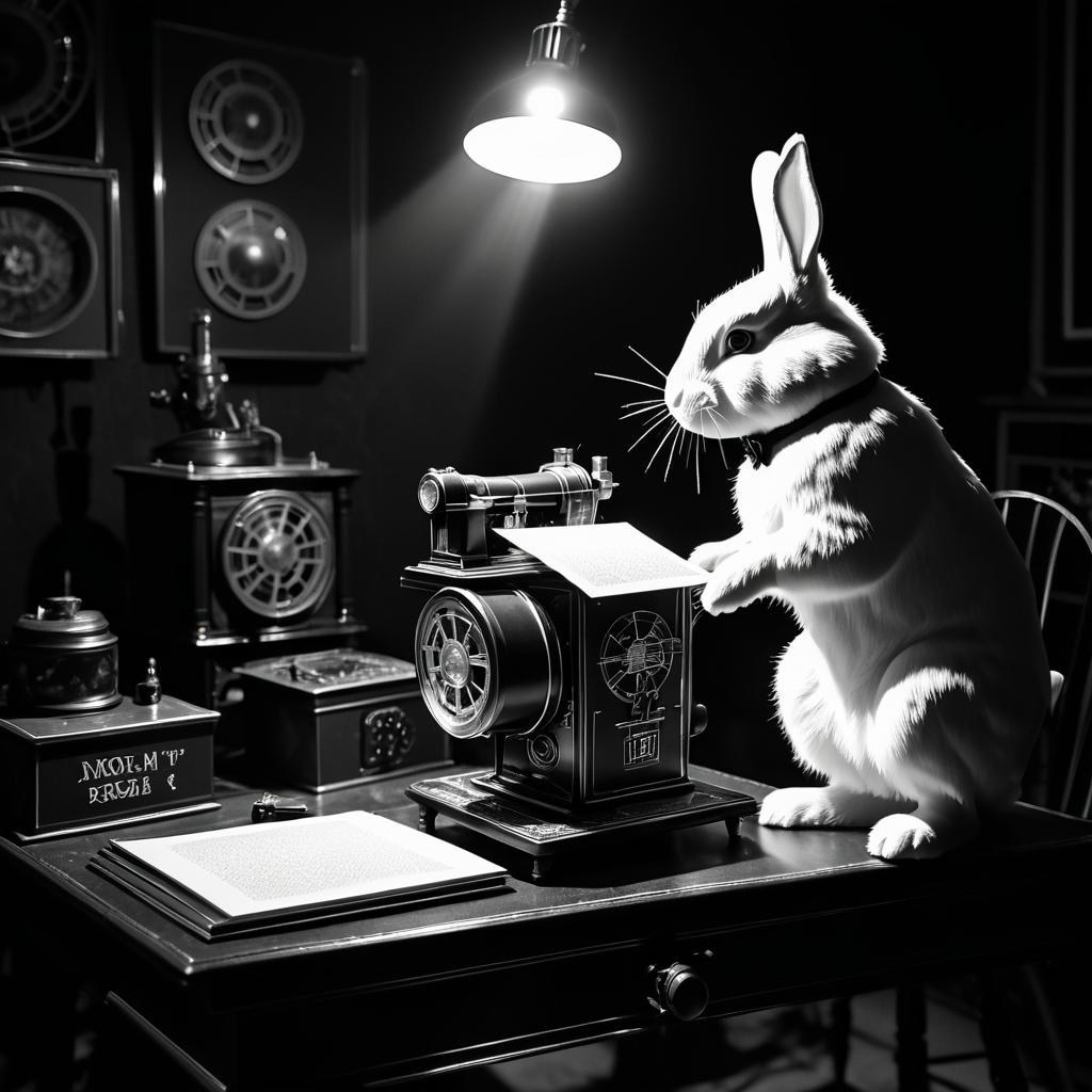 A rabbit writing a bestseller on a retro radio, smoking in a dark noir room. Black and white, 1920s aesthetic, soft table lamp lighting, detailed film grain.