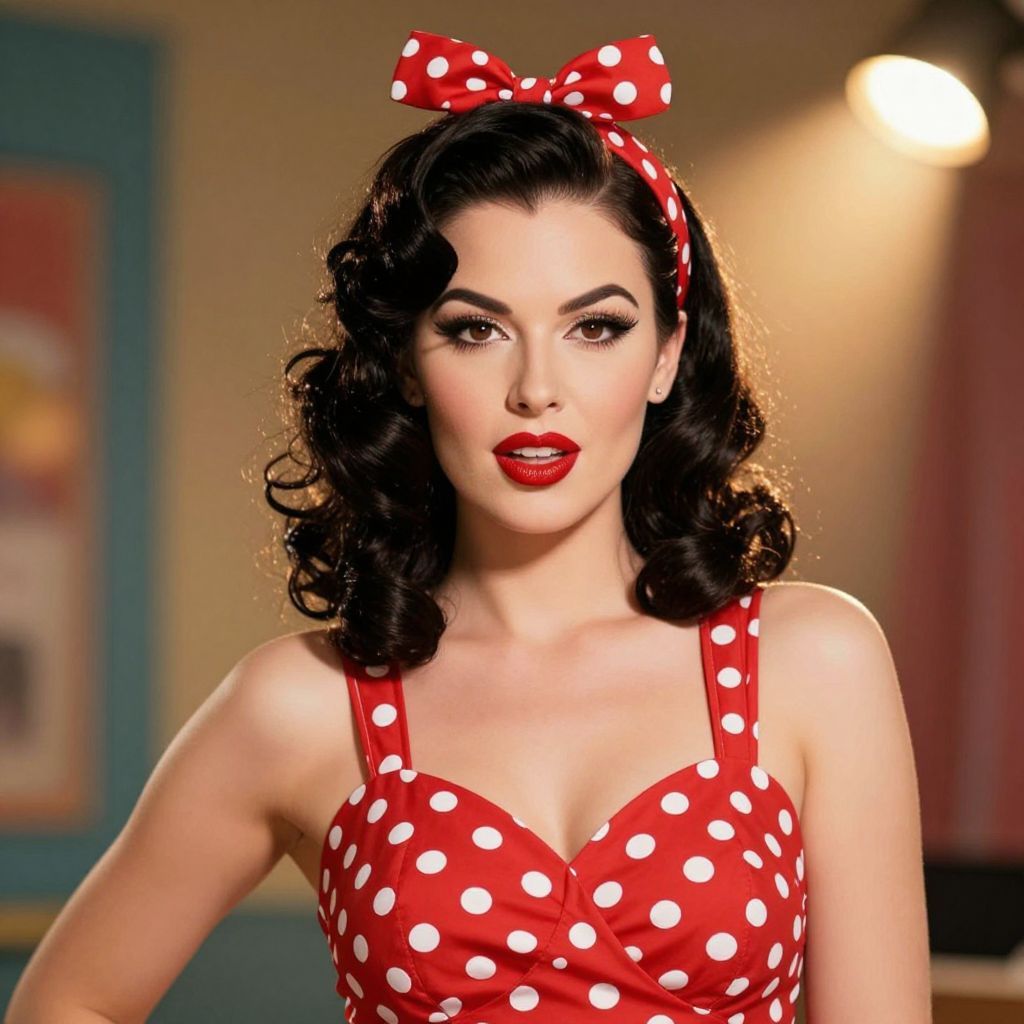A digitally rendered pin-up illustration featuring a woman with classic rockabilly styling, including a red polka-dot headband, voluminous curls, bold red lipstick, and a matching polka-dot dress, set against a vintage-inspired backdrop with dramatic lighting effects.