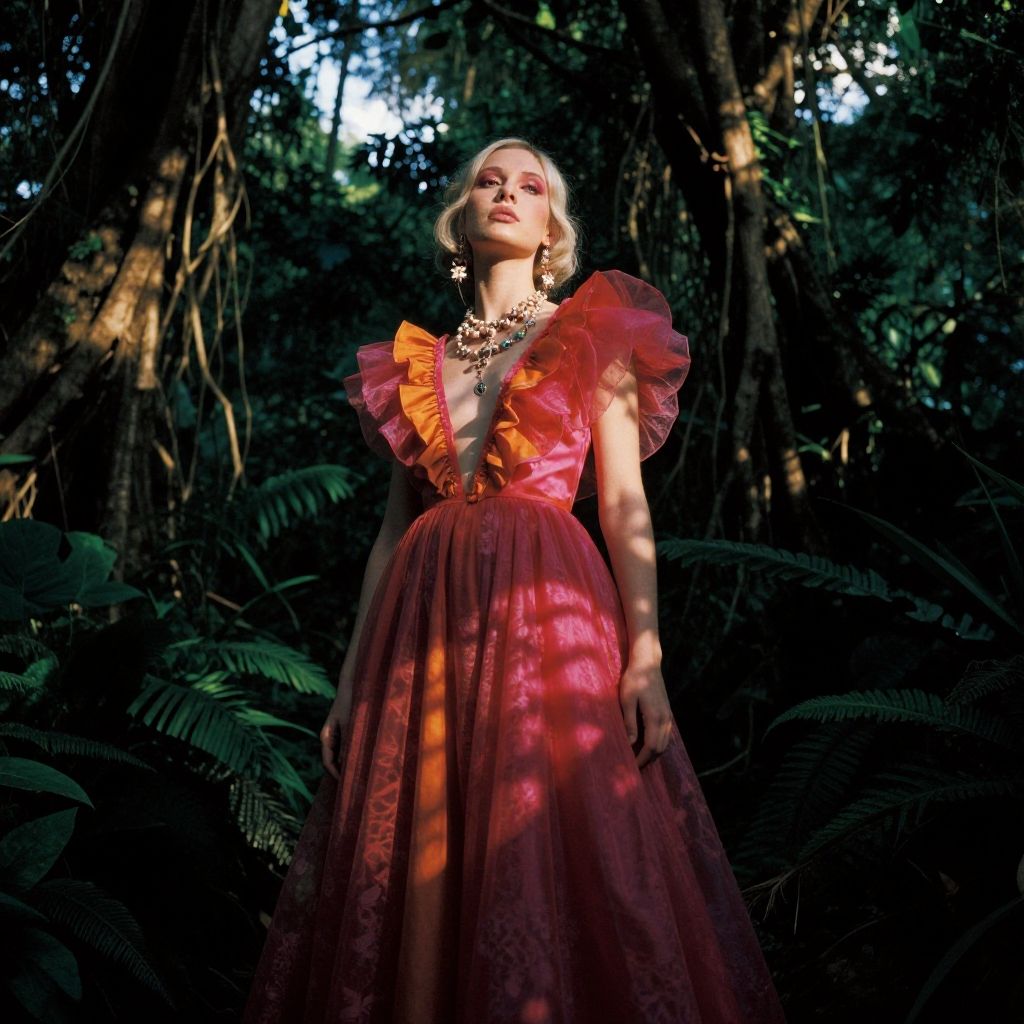 Photograph of a blonde woman in a vibrant pink, ruffled dress, standing in a shadowy, sunlit jungle, wearing a statement necklace.