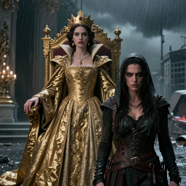 A dramatic contrast between a regal queen standing in a grand palace throne room wearing ornate gold attire and a fierce rebel figure standing outside in a stormy urban wasteland, both with intense facial expressions—queen with cold, calculating eyes and rebel with defiant, wild eyes—symbolizing regal structure versus deconstructed edge.