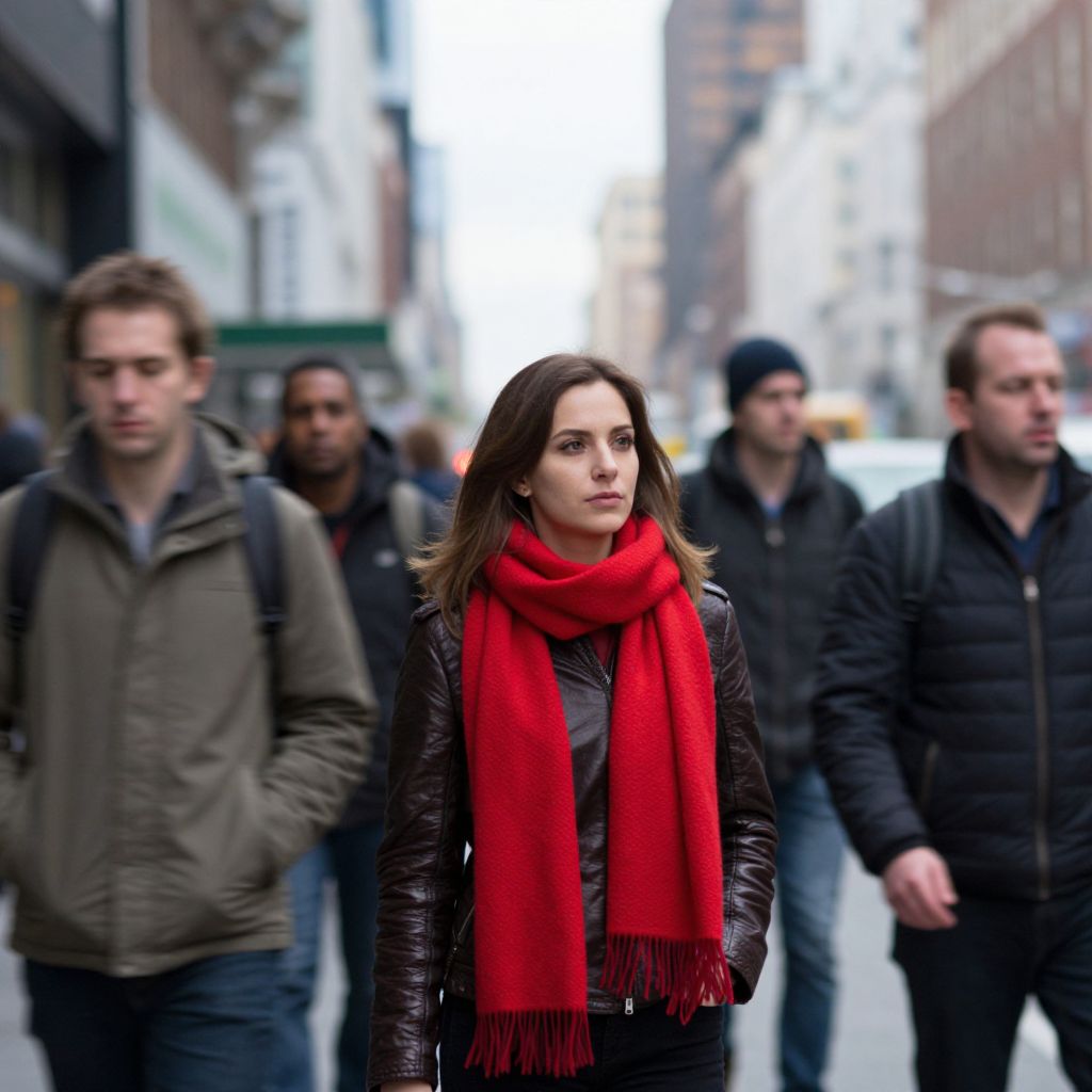 People navigate a bustling urban street, their faces blurred by motion, while a woman in the foreground stands out sharply, wearing a vibrant red scarf that contrasts against her dark leather jacket and the muted tones of the cityscape around her.