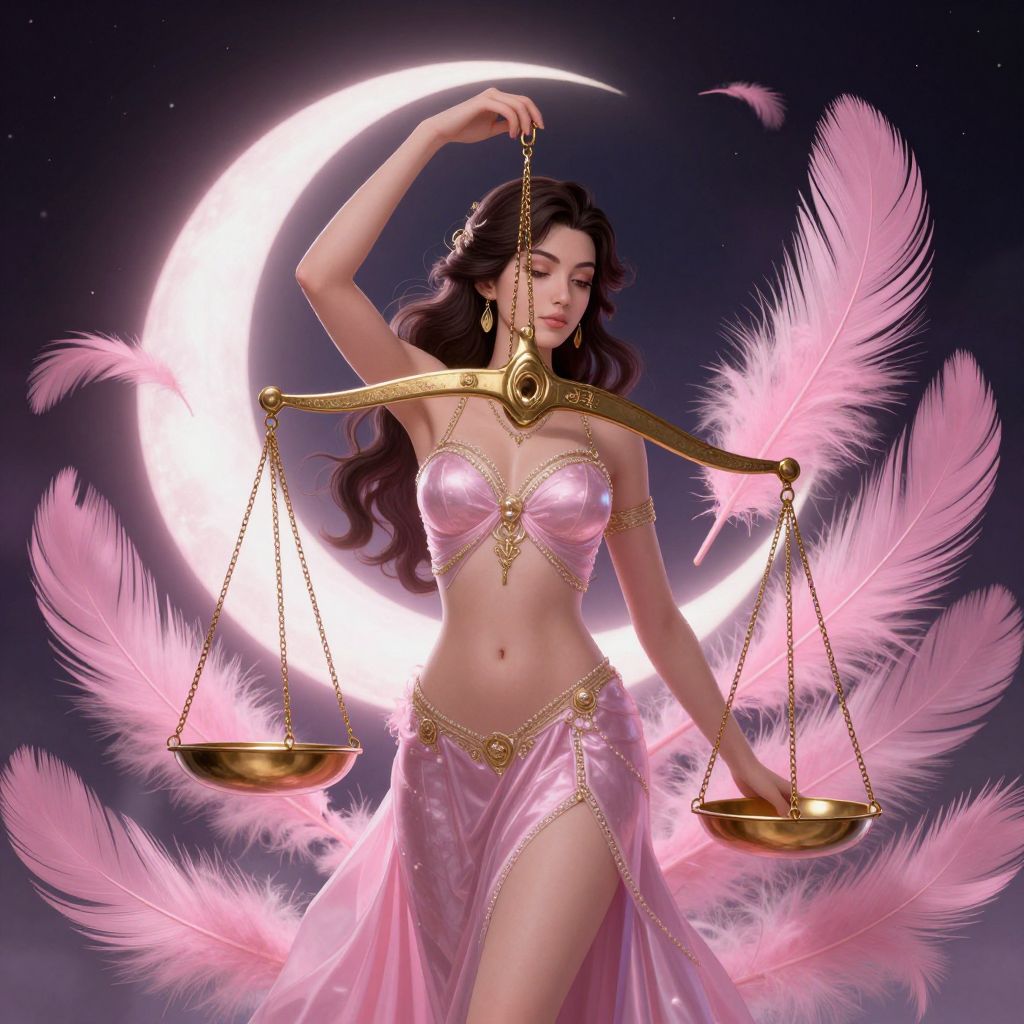 Digital art of a fair-skinned woman with long black hair, wearing pink, feather-adorned lingerie, balancing scales, under a glowing crescent