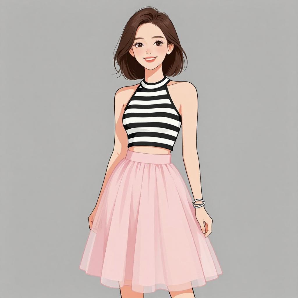 Woman with pretty face and pretty hair. smiling Woman, girly, halter top with black and white horizontal stripes, high neckline, cut-out at the midriff, paired with a pink tulle skirt, knee-length, soft pleating, waistband matching the skirt's fabric, accessorized with thin silver bangle bracelets. --sref 1467