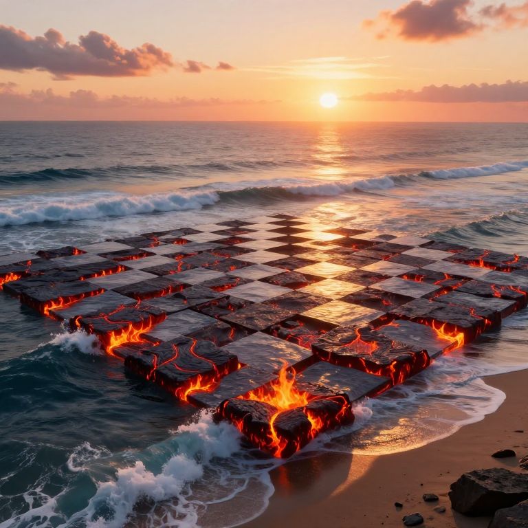 A surreal 3D-rendered seascape at golden hour features a checkerboard pattern where alternating squares transform into fiery lava, creating a dramatic and otherworldly visual effect as waves lap against the shore under a vibrant sunset sky.