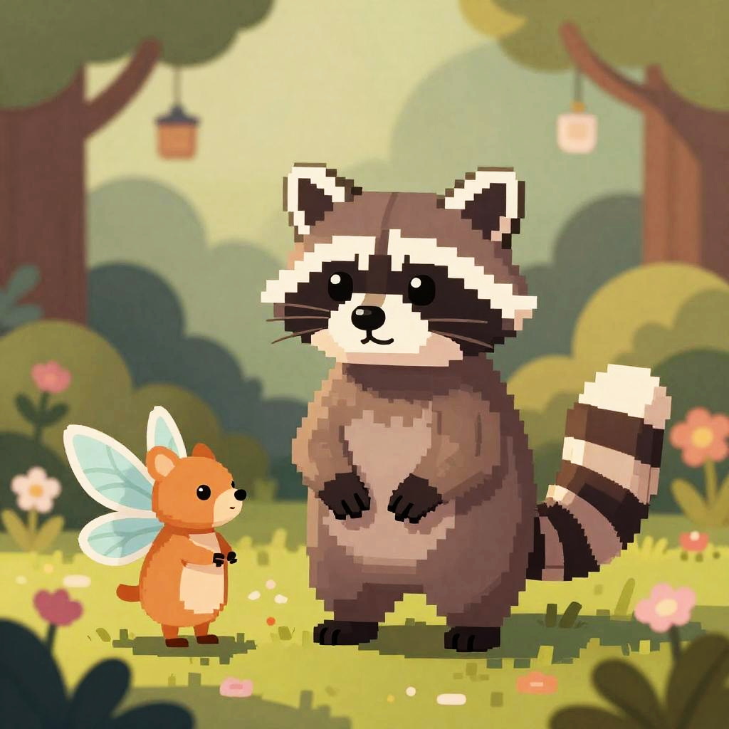 Realistic photo.Pixel art of a raccoon in a whimsical garden, fairycore, cottagecore, nostalgic, detailed foliage, warm and cozy lighting, pastel tones, high quality, cute raccoon design, fairy companion realistic photo