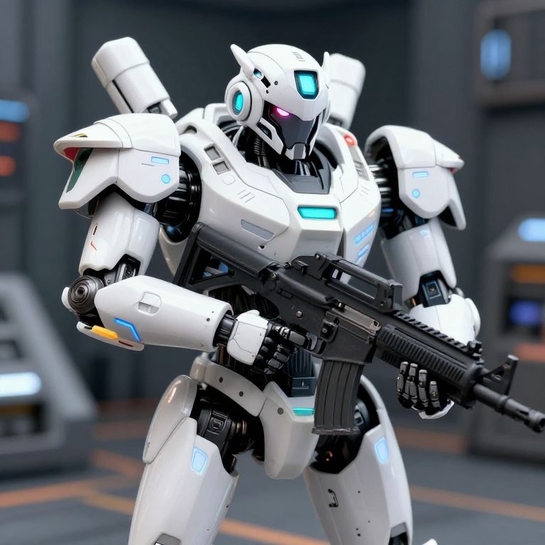 Photorealistic CGI of a white, glowing-blue-accented humanoid robot holding a black assault rifle, standing in a futuristic, industrial background.