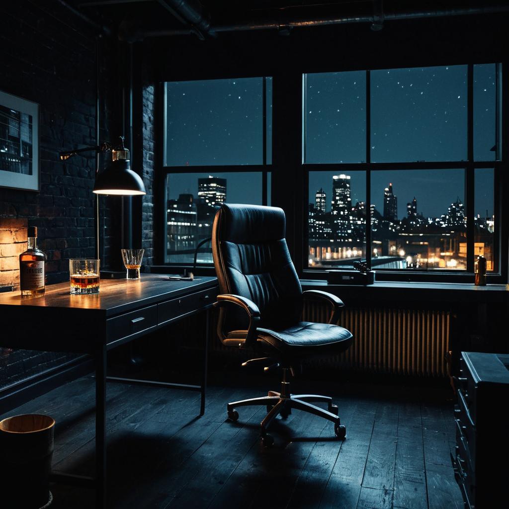 Image of a dark urban loft at midnight, with a sleek black desk, industrial black office chair, and a single glass of rye whiskey, nighttime ambiance