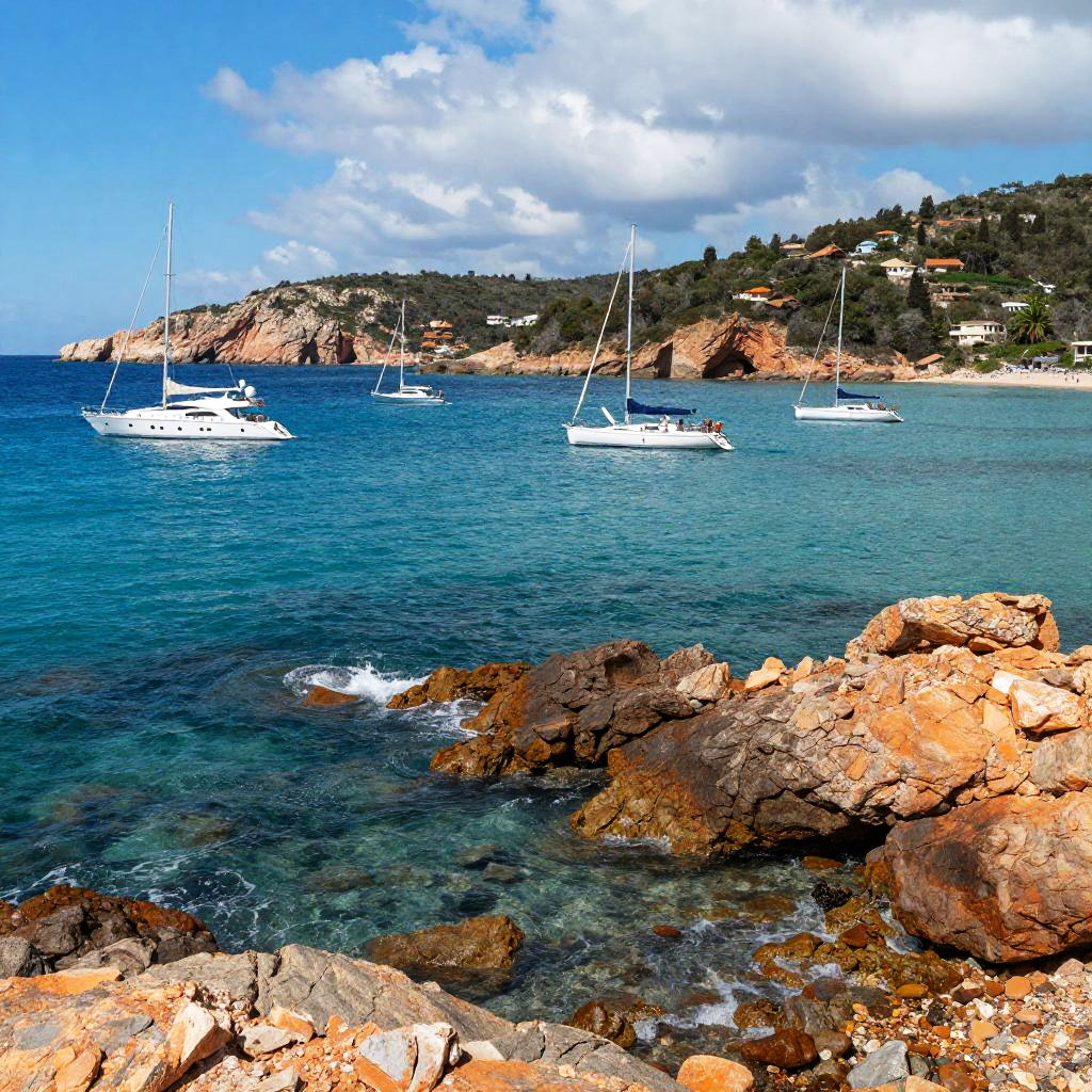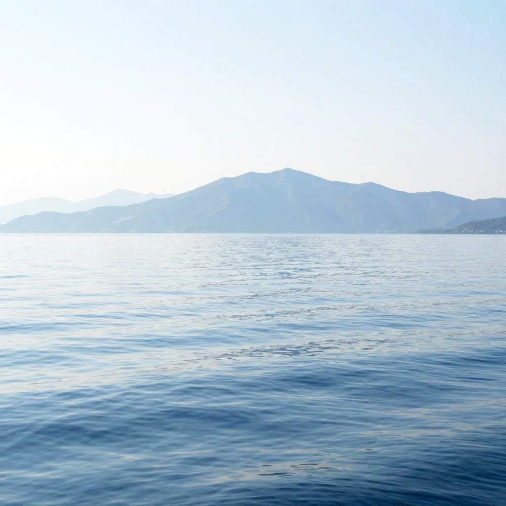 This is a colorful digital image of a coastal landscape. The foreground features rocky, orange-brown cliffs with jagged edges. The mid-ground shows a vibrant blue sea that seamlessly transitions to a lighter blue near the horizon. In the background, there are distant, hazy landmasses. The bright, clear sky is mostly white with a slight gradient to blue. The overall scene is bright and vivid, with sharp contrasts between the rocks and water.